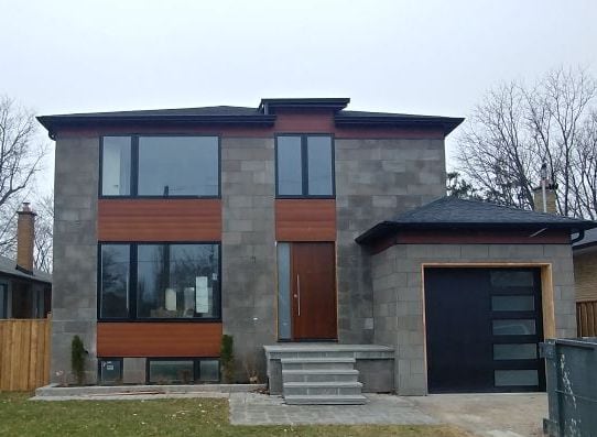 Our installation team just completed work on a house in Etobicoke. We installed metal siding on the facade, as well as soffits, fascia and downspouts. Harrywood steel siding in Cedar colour was chosen by the customer. It excellently mimics woodgrain texture and complements the house architecture.